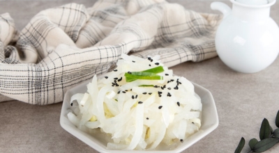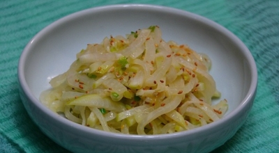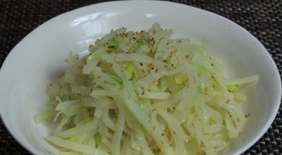 재료 : 무, 다진 마늘 반 큰술, 들기름 반 큰술, 소금, 양조간장 반 큰술, 참기름 반 큰술, 무 크기로 썬 파, 통깨 반 큰술, 검은깨 약간