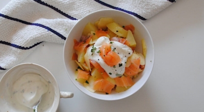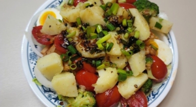 삶은 감자에 소금 반꼬집 올리브유 한 큰 술을 둘러주며 쪽파 약간 넣어줘요. 감자가 뜨거울 때 뿌려줘야 양념을 쫙 빨아들입니다. 양념 후 뚜껑 덮어 5~10분간 두면 감자가 양념을 흡수해서 맛있어져요. 반숙으로 삶은 계란을 조심히 잘라줘요.
